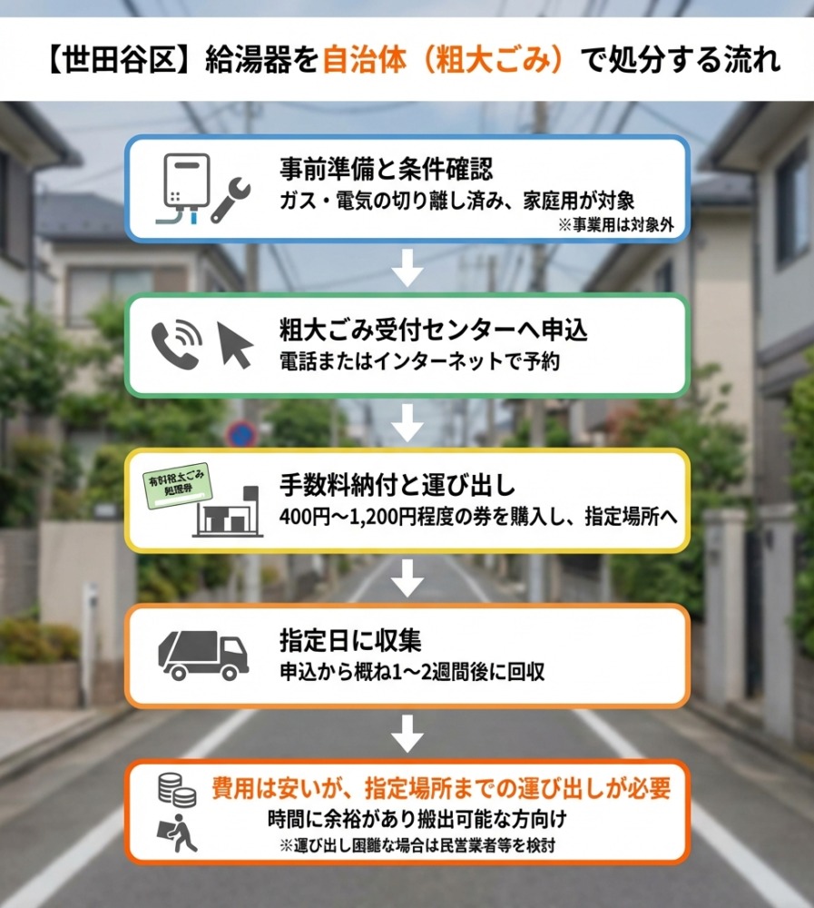 世田谷区では、給湯器の処分を自治体サービスとして受けることができますが、処分方法によって手続きが異なります。